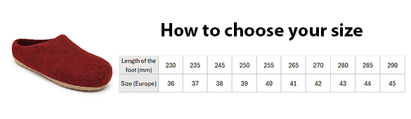 All our slippers are made from natural felt, 100% sheep’s wool. Our designs are available with either a non-slip polyurethane sole (suitable for outdoor use) or a natural leather sole.
